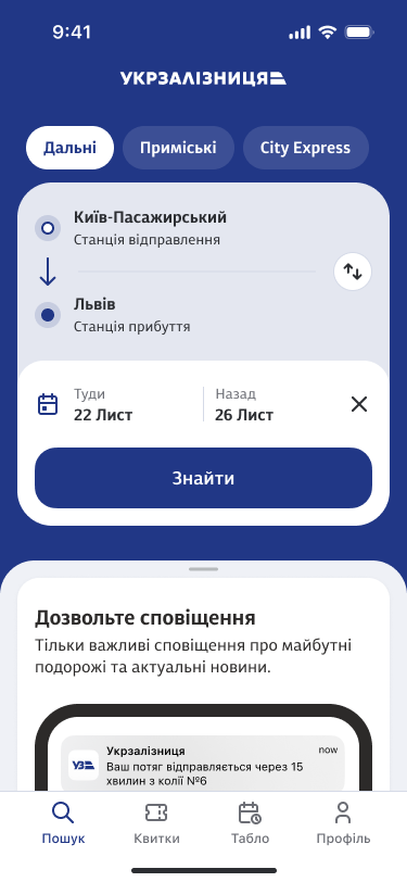 щиро дякую за додаток, тепер це супер зручно, інтуітивно зрозуміло та швидко. додатково дякую за вчасні нагадування про відправлення потяга, та усю необхідну інформацію на одному екрані